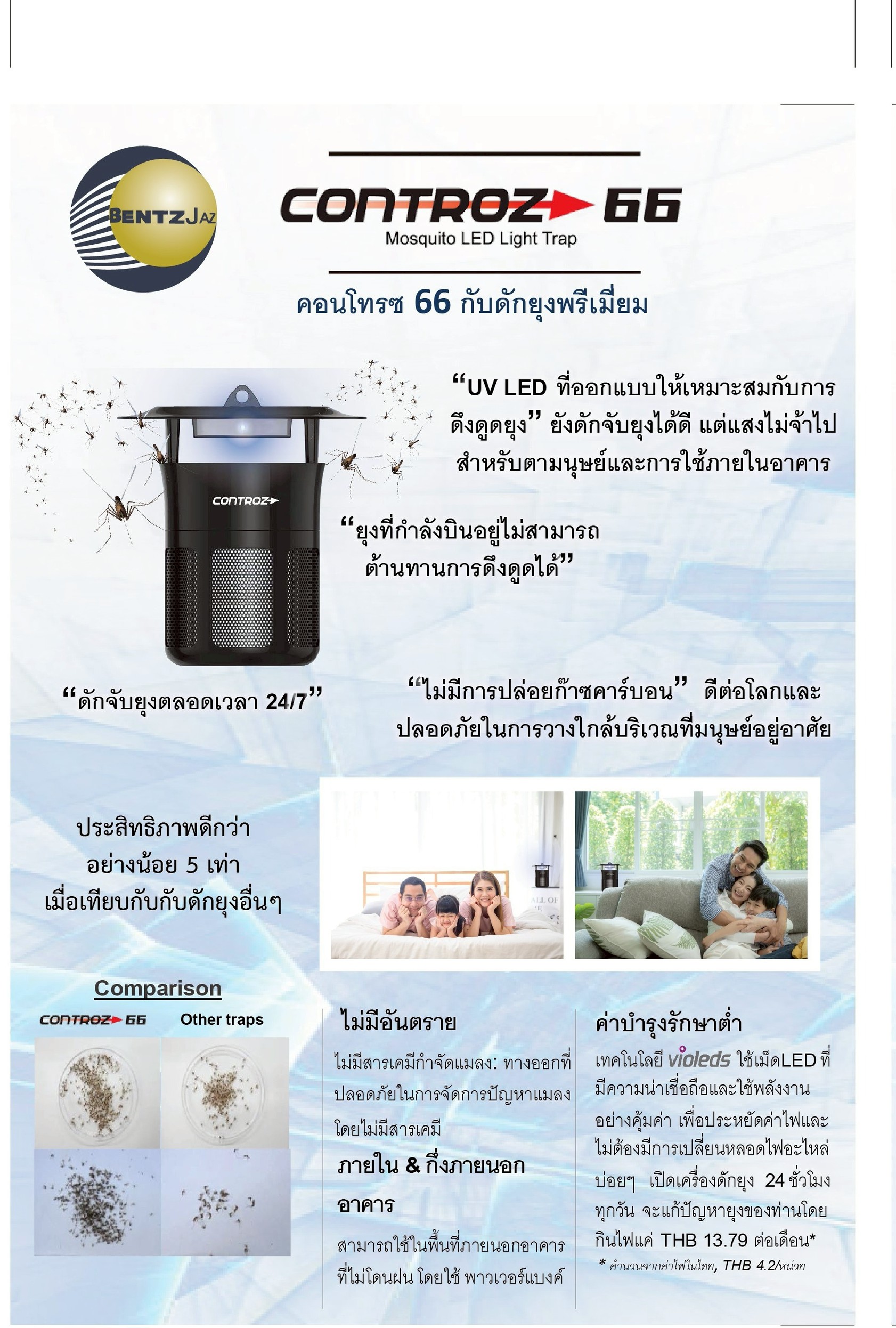 Controz 66 ใช้ UV LED ที่ได้รับการออกแบบและพัฒนาร่วมกับบริษัทเทคโนโลยี LED ชั้นนำของเกาหลี โดยมีการปรับคลื่นแสงให้เหมาะสมกับการดึงดูด ยุง อย่างมีประสิทธิภาพสูงสุด ซึ่งแสงที่ใช้ในการดึงดูดยุงนั้น ไม่จ้าและไม่เป็นอันตรายต่อสายตามนุษย์ ทำให้สามารถใช้งานภายในอาคารได้อย่างสบายใจตลอด 24 ชั่วโมง